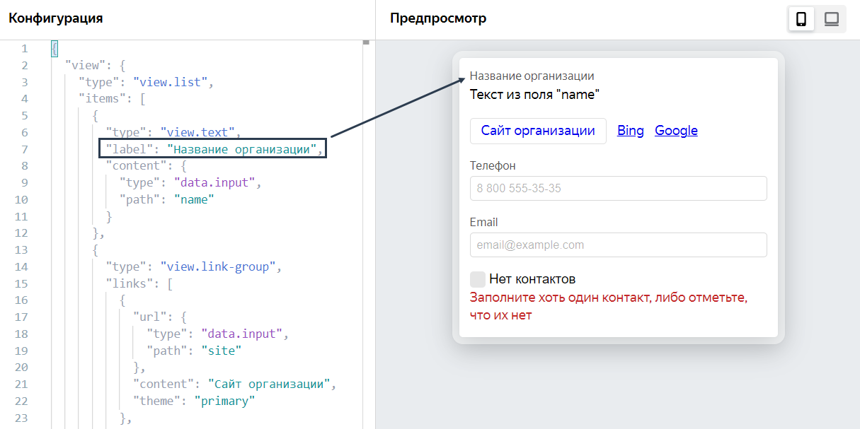 В редакторе интерфейса внесите изменения в соответствии со своим проектом. Например, чтобы изменить объект, о котором исполнители должны найти информацию, в разделе Конфигурация отредактируйте код: замените текст в свойстве label вашим значением.