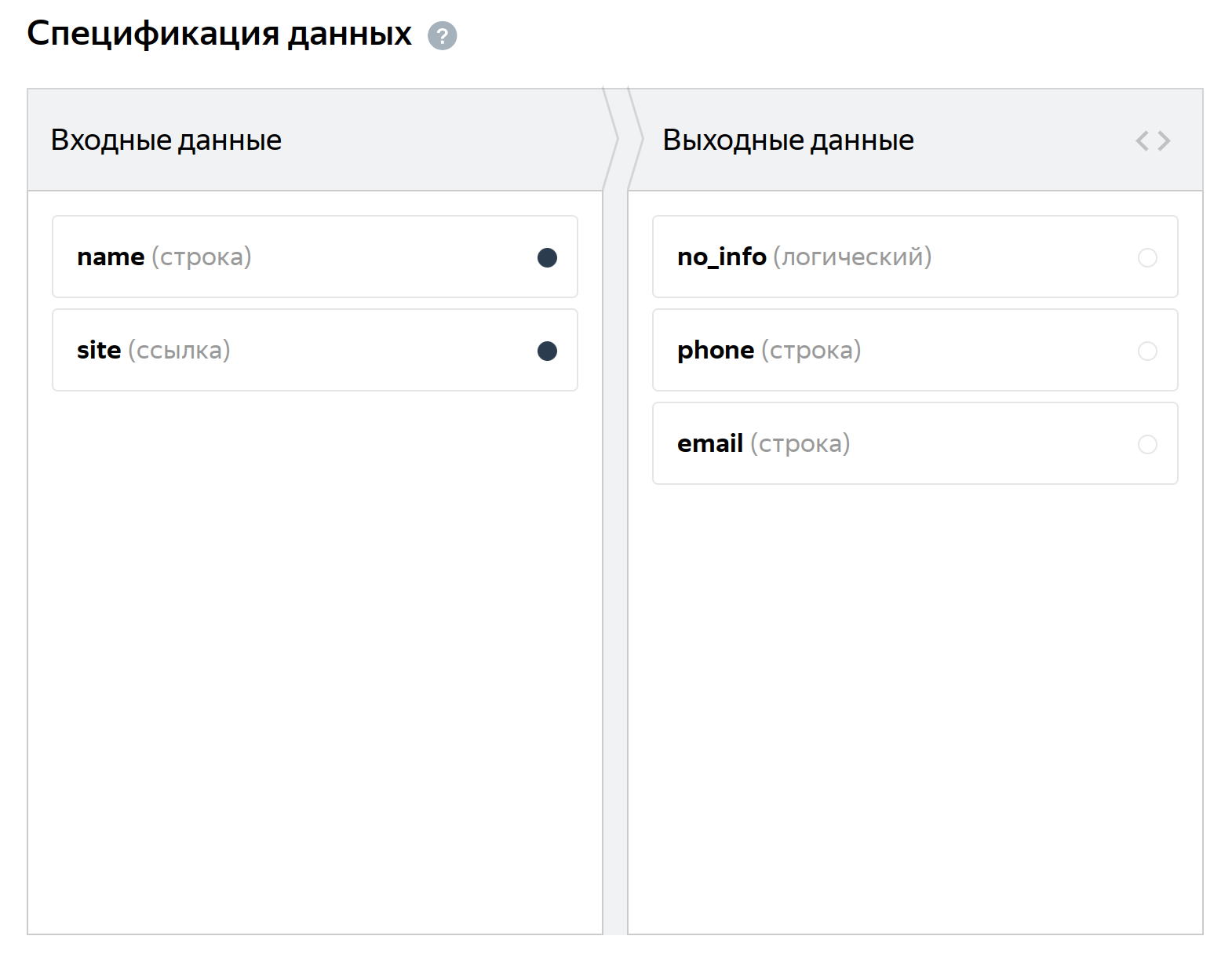 Чтобы определить, какие данные вы будете передавать исполнителю и получать в ответ, необходимо создать поля входных и выходных данных.