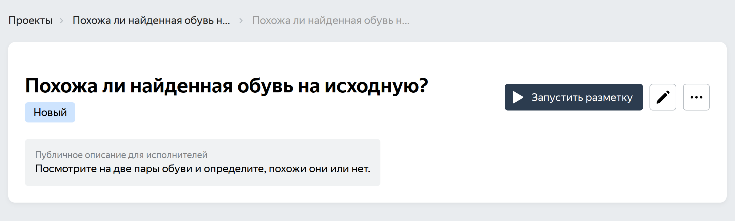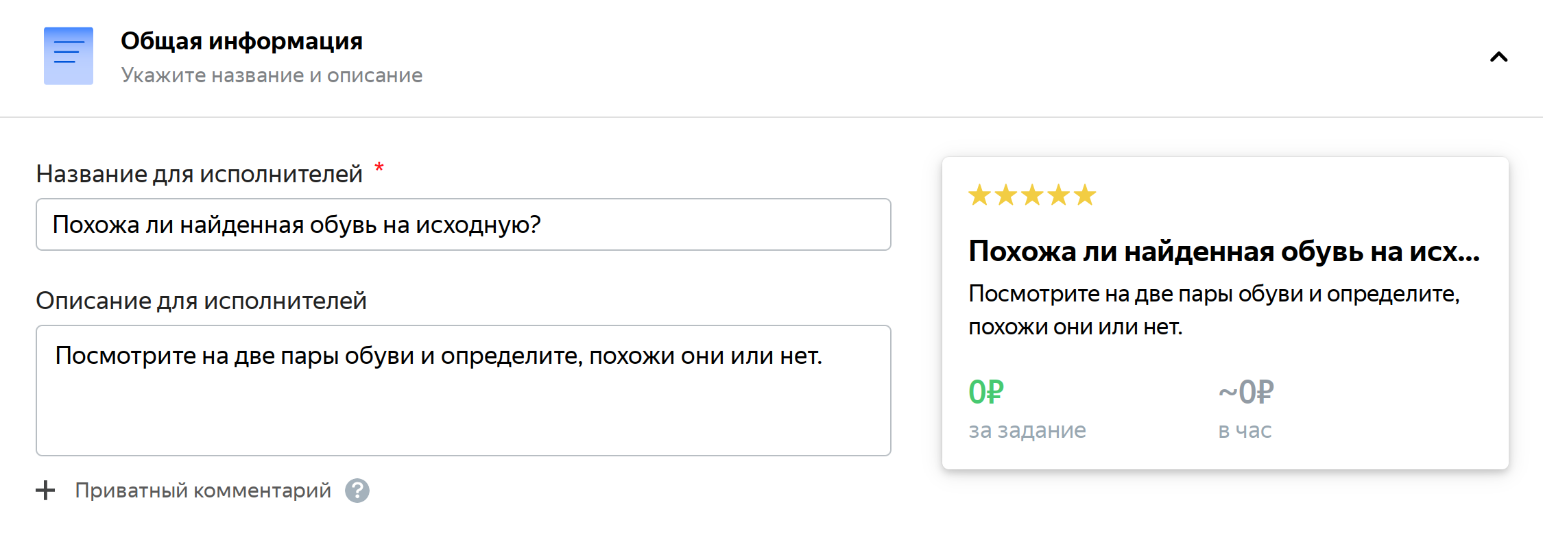Описание для исполнителей — краткое описание, которое будет отображаться в списке заданий для исполнителей. Например, вы можете указать такое описание: Посмотрите на две пары обуви и определите, похожи они или нет..