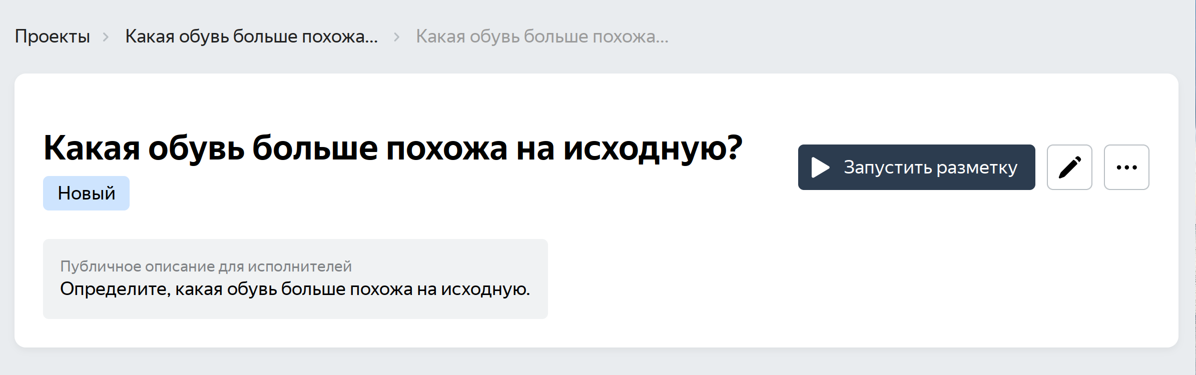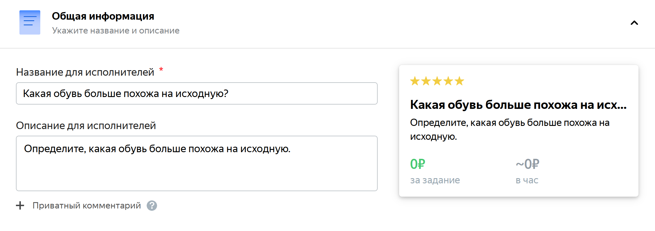 Описание для исполнителей — краткое описание, которое будет отображаться в списке заданий для исполнителей. Например, вы можете указать такое описание: Определите, какая пара обуви больше похожа на исходную..