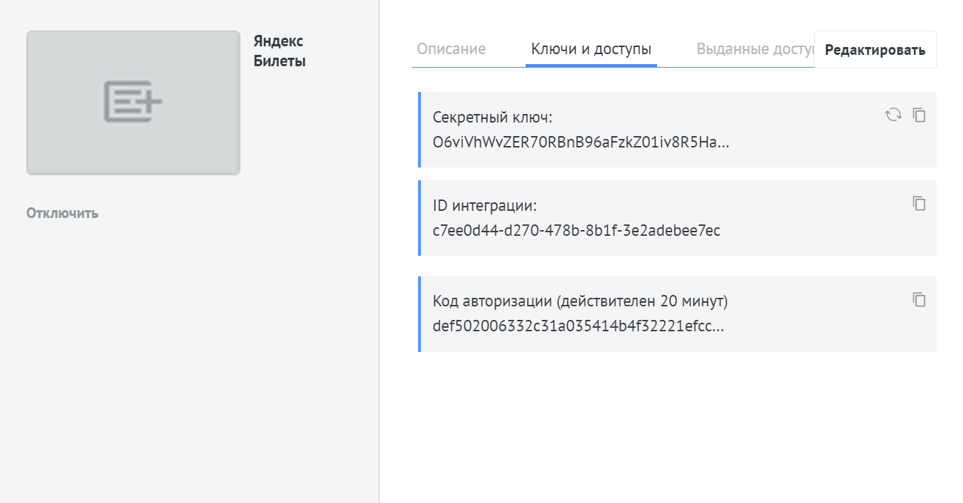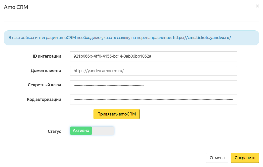 Обратите внимание: код авторизации действителен всего 20 минут. Если вы не успеете подключить интеграцию в Яндекс Билетах за это время, вернитесь на вкладку Ключи и доступы в amoCRM и скопируйте код авторизации заново.