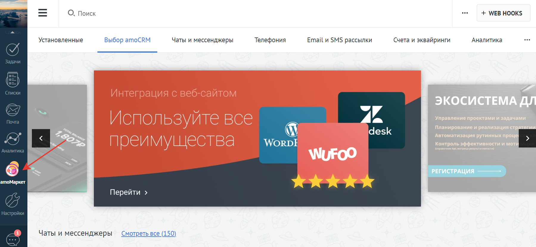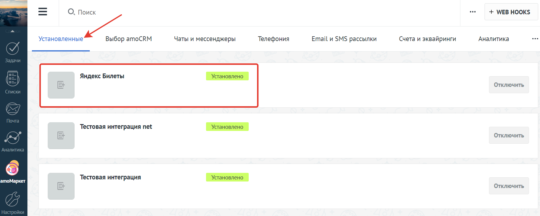 Зайдите в систему Яндекс Билеты и в меню слева нажмите Система → Интеграции → Amo CRM. Если вам недоступен раздел Интеграции, напишите в службу поддержки.