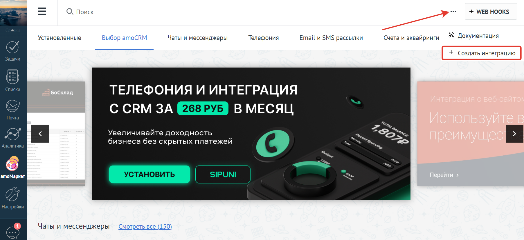 В правом верхнем углу нажмите на три точки. В раскрывшемся списке выберите Создать интеграцию.