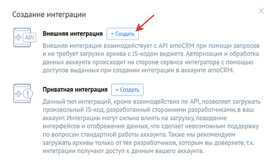 Создайте Внешнюю интеграцию в открывшемся окне.