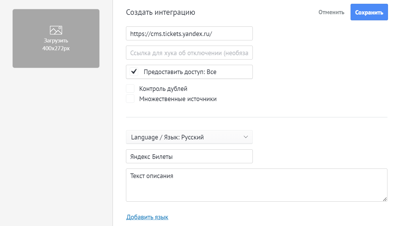 Шаг 2. Создайте интеграцию в системе Яндекс Билеты