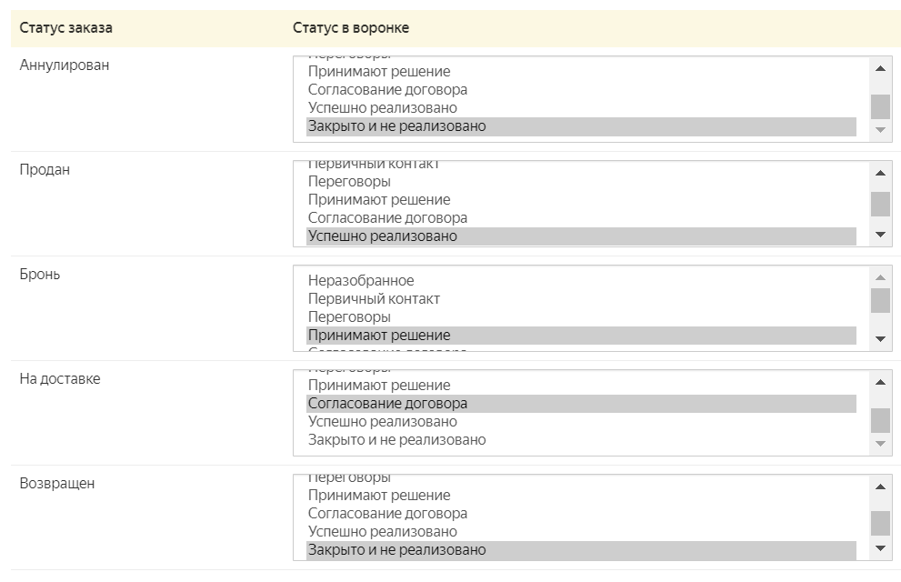 Переговоры — можно удалить этот этап, если воронка используется только для интеграции Яндекс Билетов;