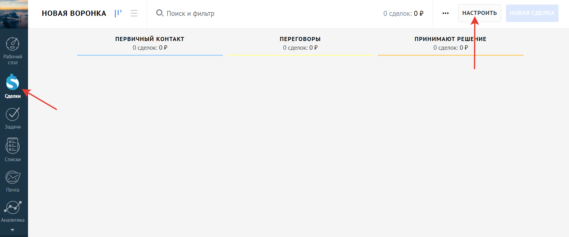 В меню слева нажмите Сделки. Выберите нужную воронку или создайте новую и в правом верхнем углу нажмите Настроить.