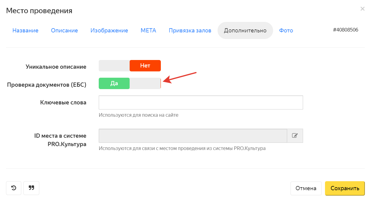 Если ваше событие проходит в московских госучреждениях из перечня mos.ru, перейдите на вкладку Дополнительно и переведите переключатель Проверка документов (ЕБС) в положение Да, чтобы передавать всю необходимую информацию в Единую билетную систему.