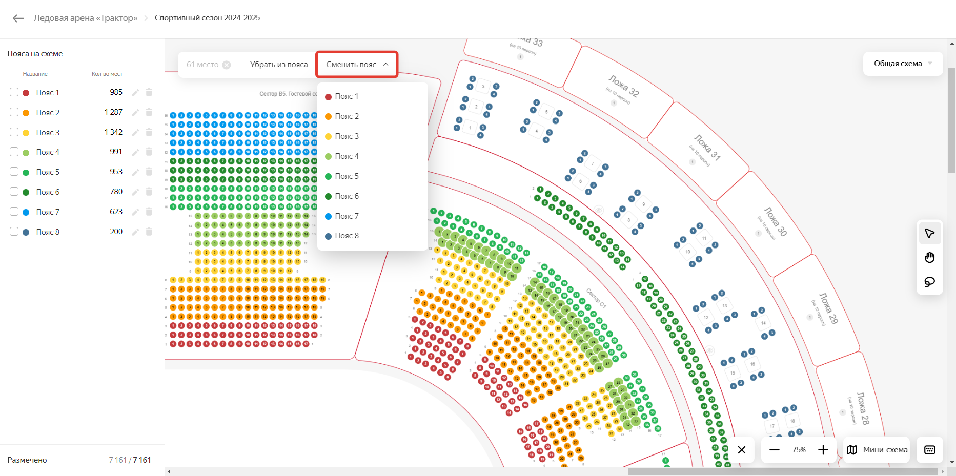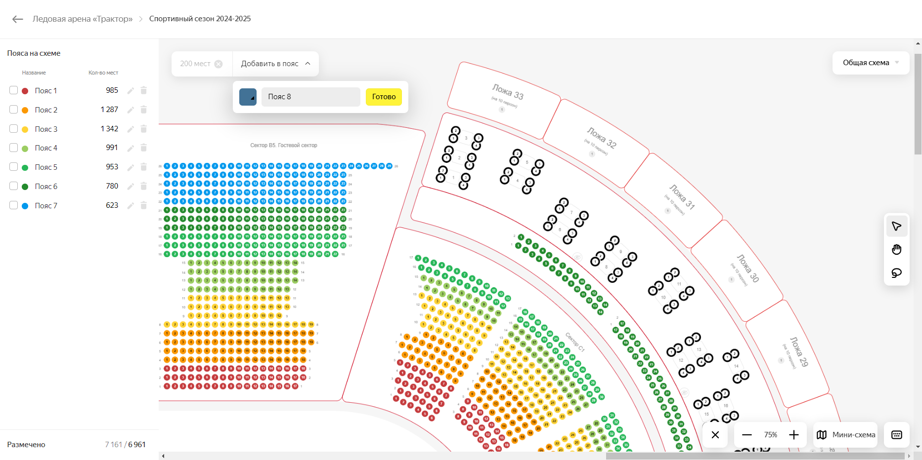 Выделите места на схеме зала и укажите название пояса. После этого вы сможете добавлять места в существующий пояс или создать новый.