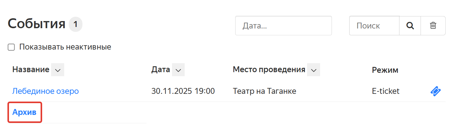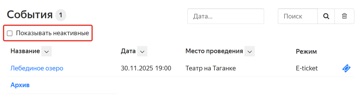 По умолчанию в личном кабинете видны только активные объекты, они выделены голубым цветом. Прошедшие события, завершившиеся скидки, удалённые залы обозначены серым цветом, перечёркнуты и находятся в папке Архив в конце списка.
