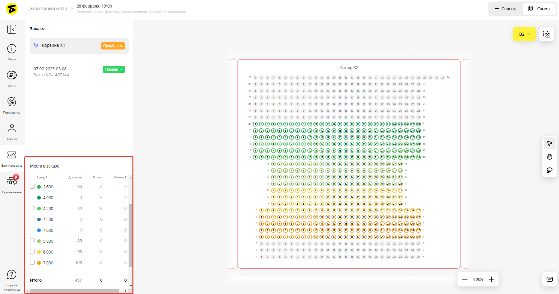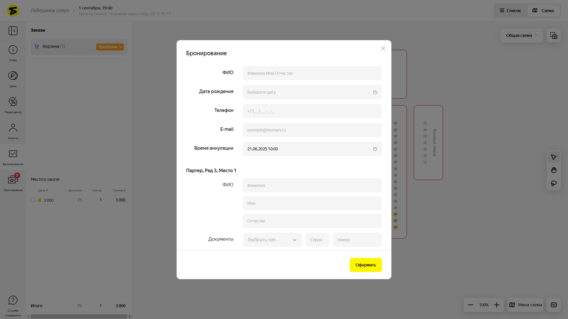 В разделе Бронирование создаются заказы, например, для временной брони билетов или заказов для юридических лиц. Вы можете работать в нём только с теми местами, которые расценены, выведены в продажу и не переданы агентам.