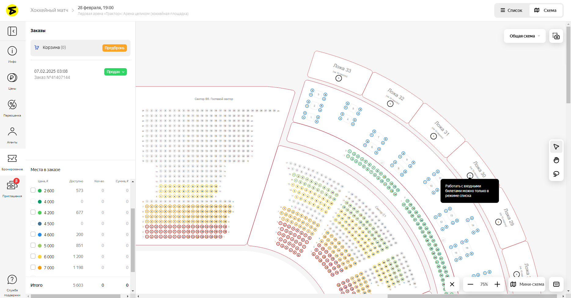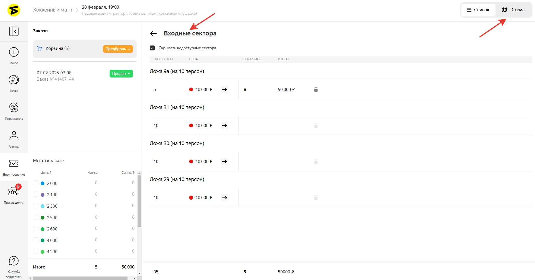 в правом верхнем углу. В режиме списка секторов можно забронировать и входные билеты, и сидячие места.