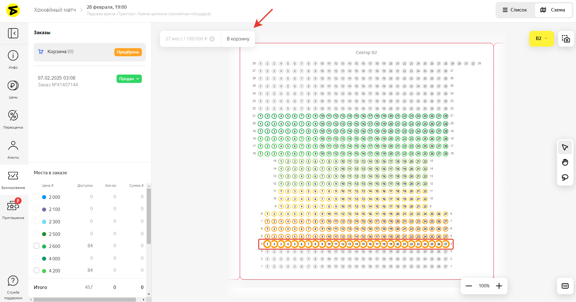 Нажмите на название нужного сектора в блоке Сидячие сектора, выделите на схеме нужные места и нажмите кнопку В корзину.