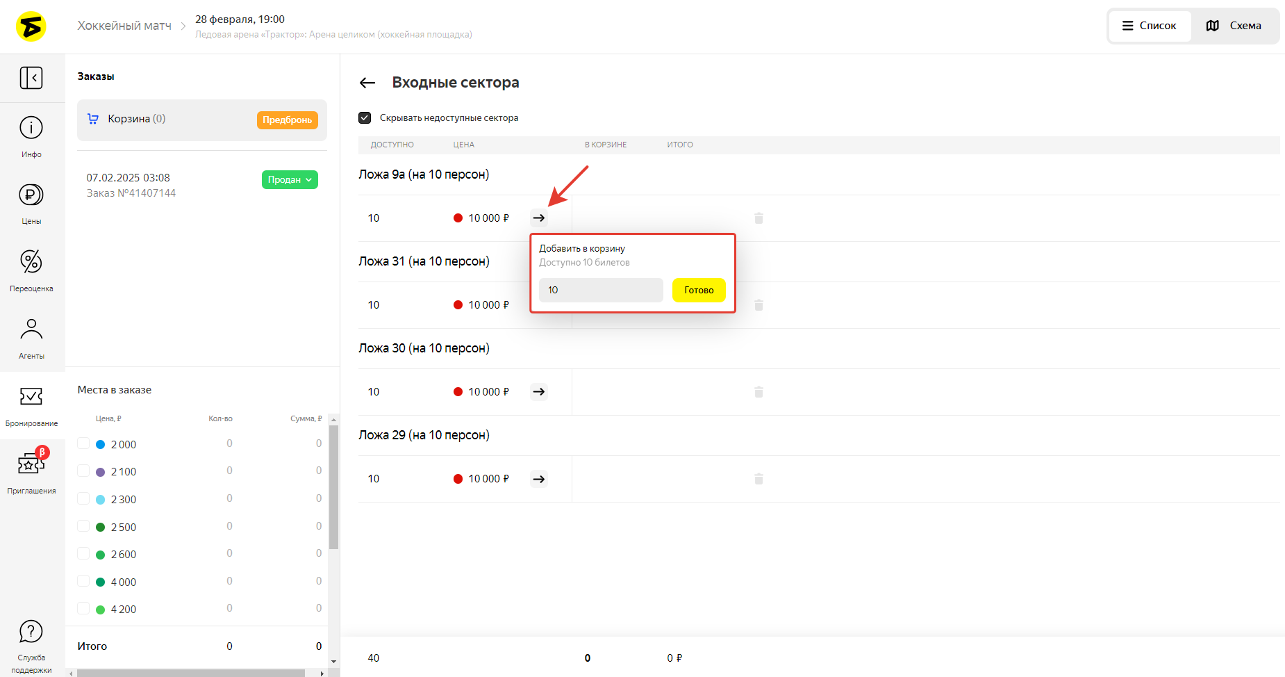 в строке с сектором и ценовой категорией, из которой хотите забронировать билеты. -