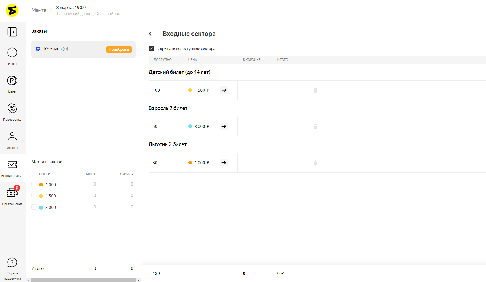 В режиме бронирования вы можете работать только с теми местами, которые расценены, выведены в продажу и не переданы агентам. Категории доступных билетов отображаются в виде таблицы.