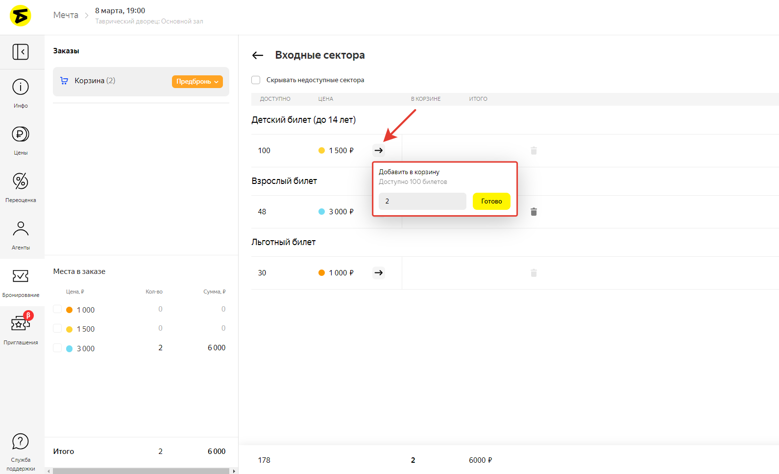 Введите количество билетов, предназначенных для брони, в поле Добавить в корзину и нажмите кнопку Готово.