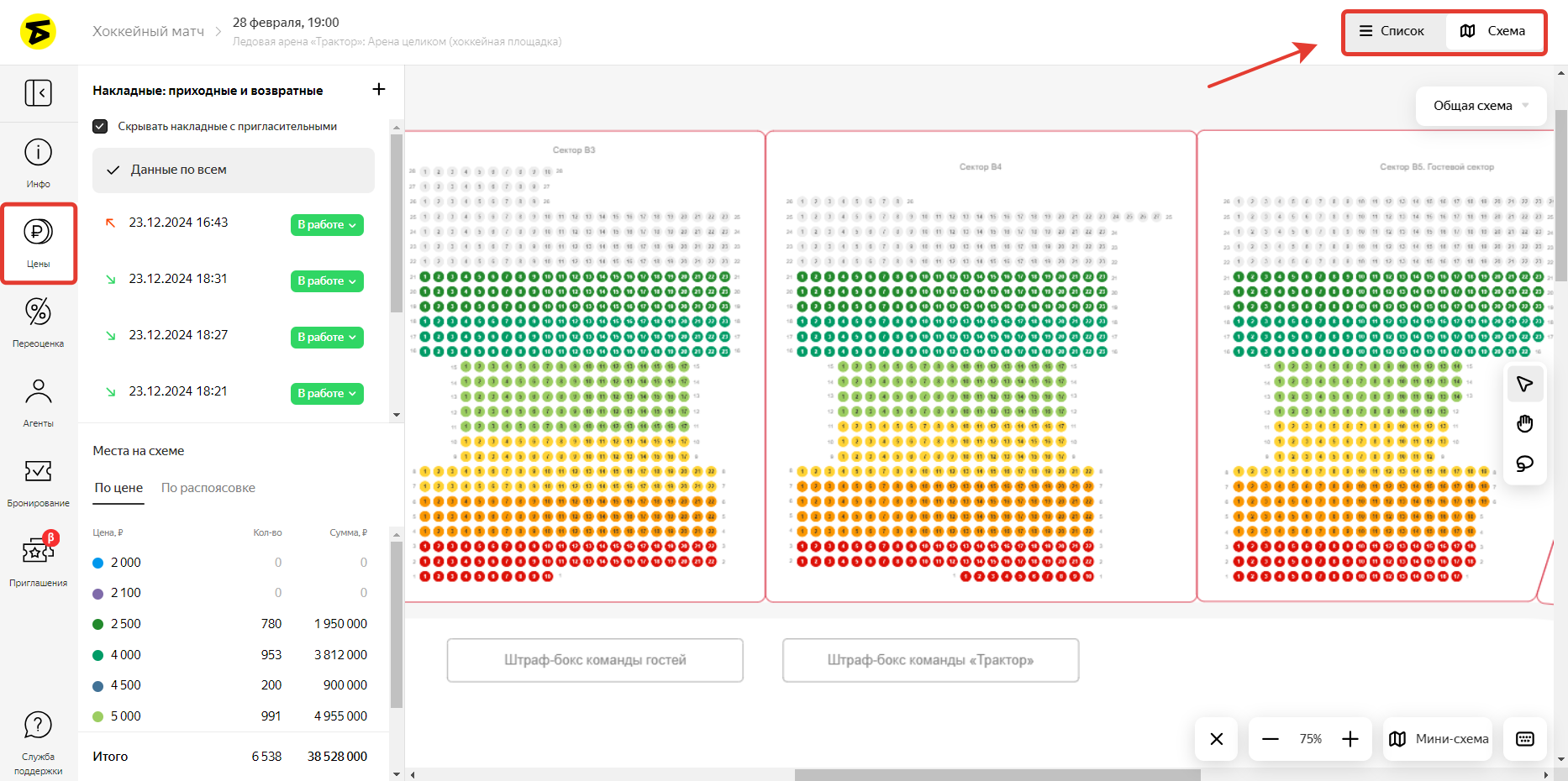 Если в накладную заводятся и сидячие места, вернитесь к списку секторов по заголовку Входные сектора. Также в режим схемы зала можно перейти нажав на переключатель в правом верхнем углу.