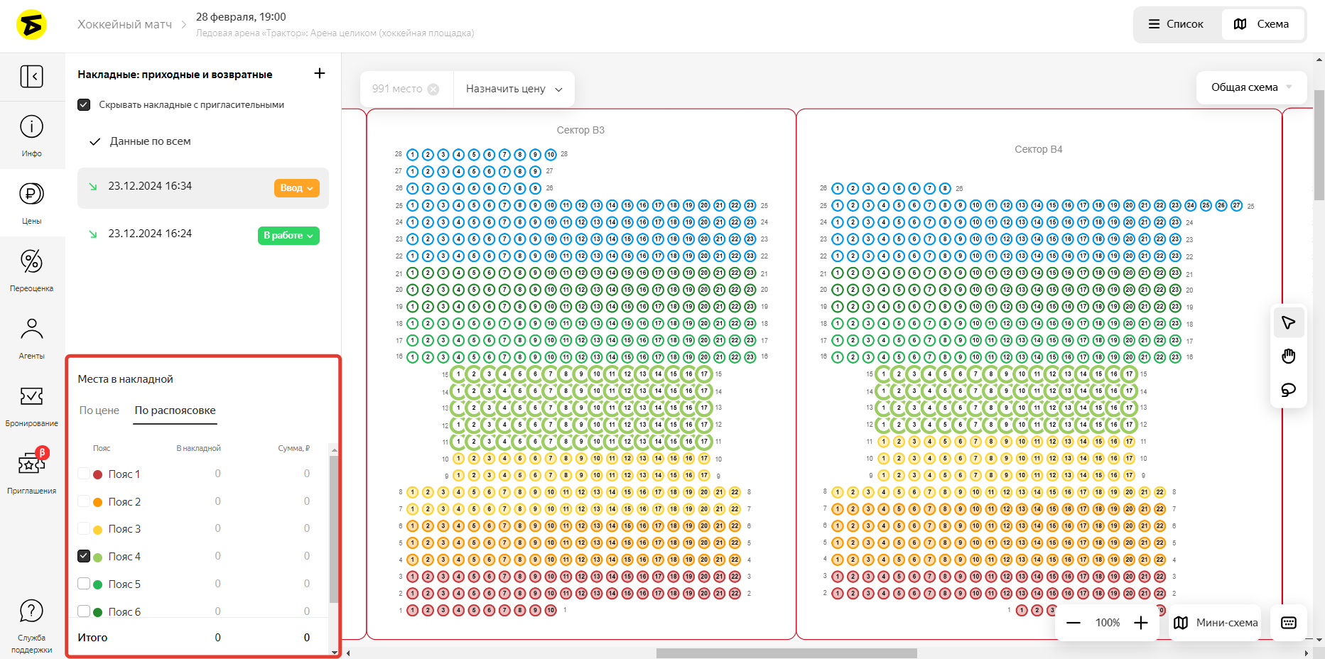 Если к событию привязана распоясовка, выберите галочкой пояс в блоке Места в накладной → По распоясовке, чтобы выделить все места в поясе в 1 клик.