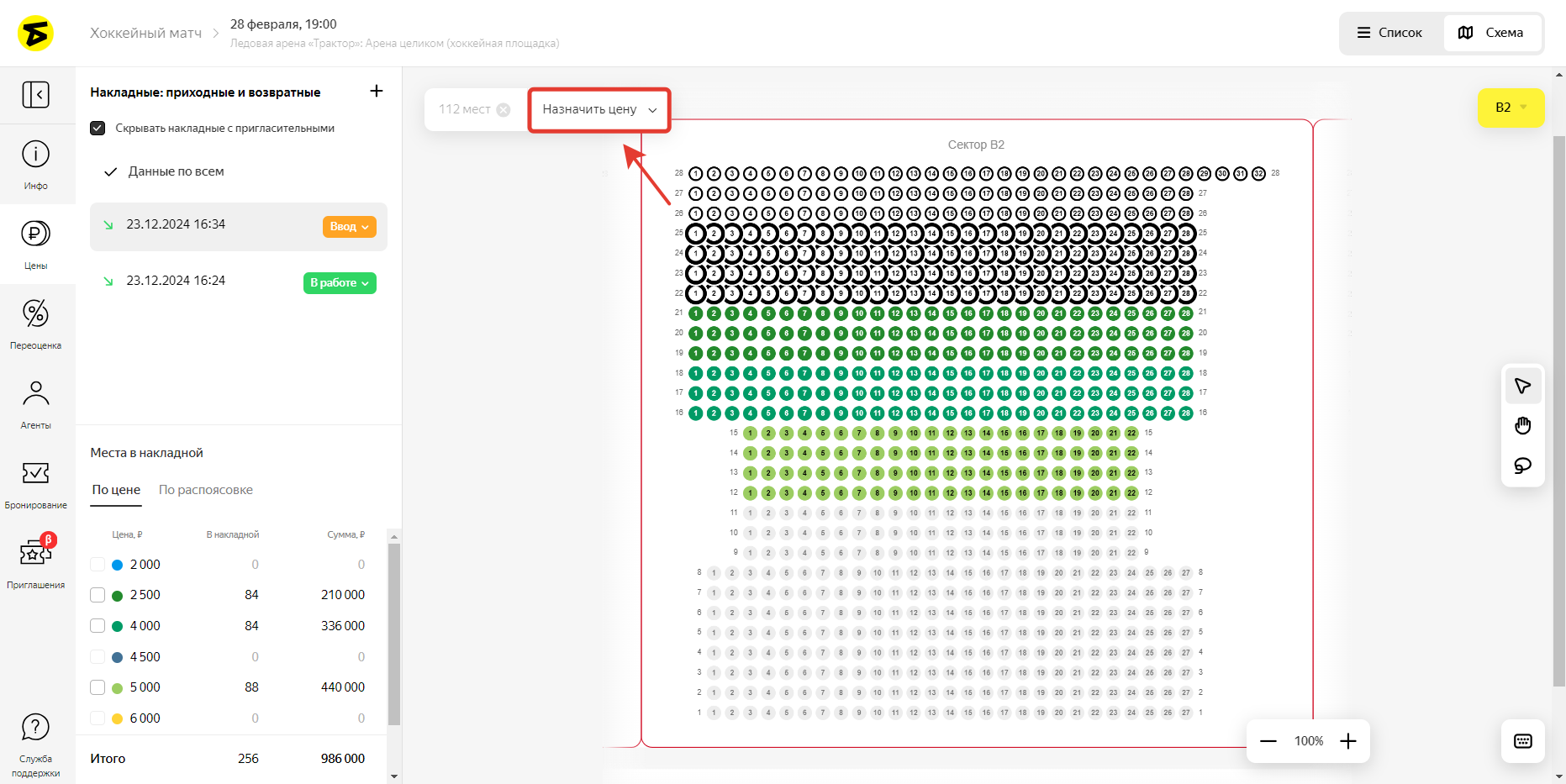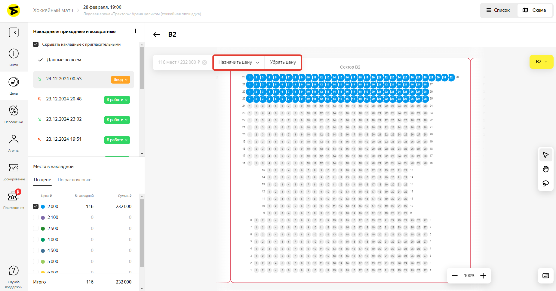 В режиме схемы места размечены в соответствии с возможностью добавить их в накладную. Места с серой заливкой можно расценить и добавить в накладную. Места с цветной заливкой уже расценены и недоступны — они сгруппированы по цвету в зависимости от цены.