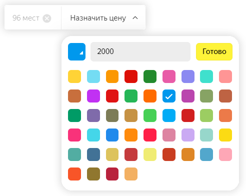 В левом верхнем углу нажмите Назначить цену, чтобы указать цену билетов для выбранных мест. Для каждой новой цены вы можете выбрать цвет заливки и обводки, который будет использоваться для группировки мест на схеме.