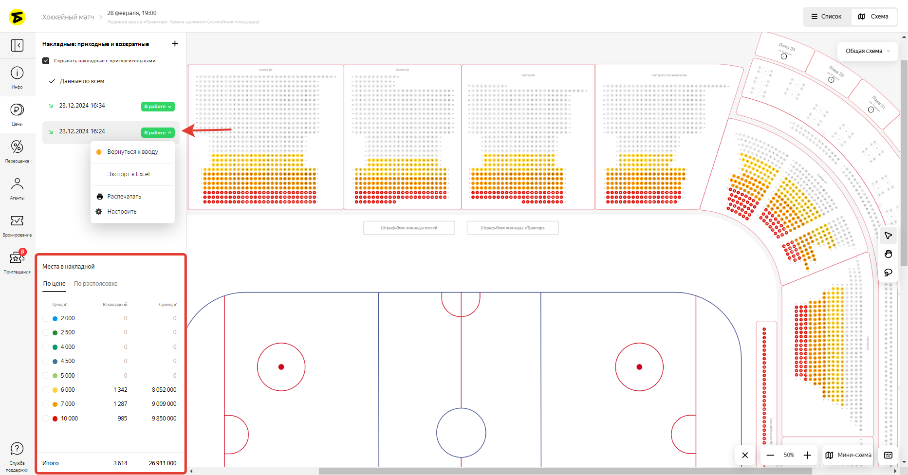 - Если накладная отправлялась в работу, в неё можно добавить только новые билеты. Места, отправленные в продажу, получится вывести только через возвратную накладную.