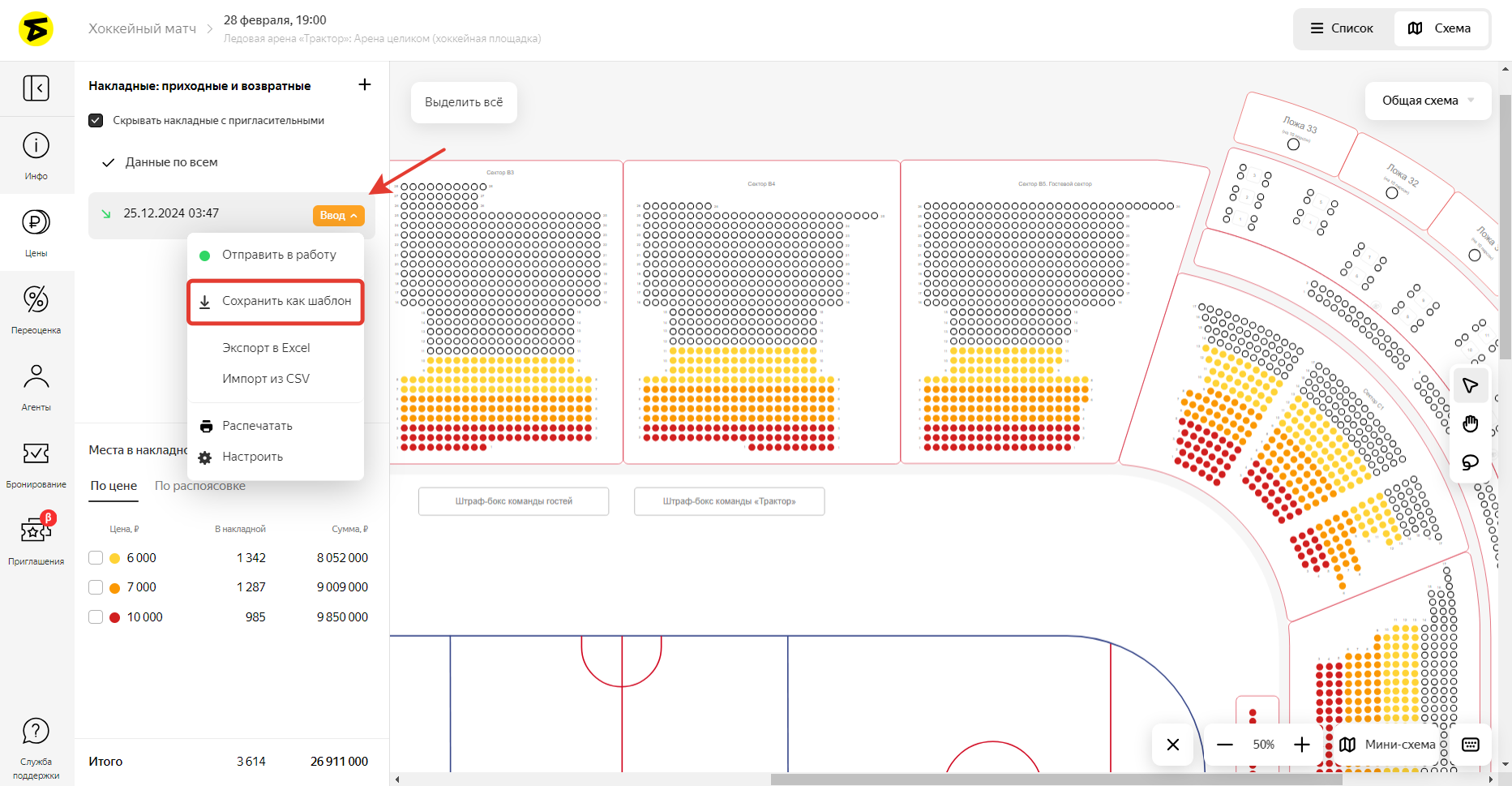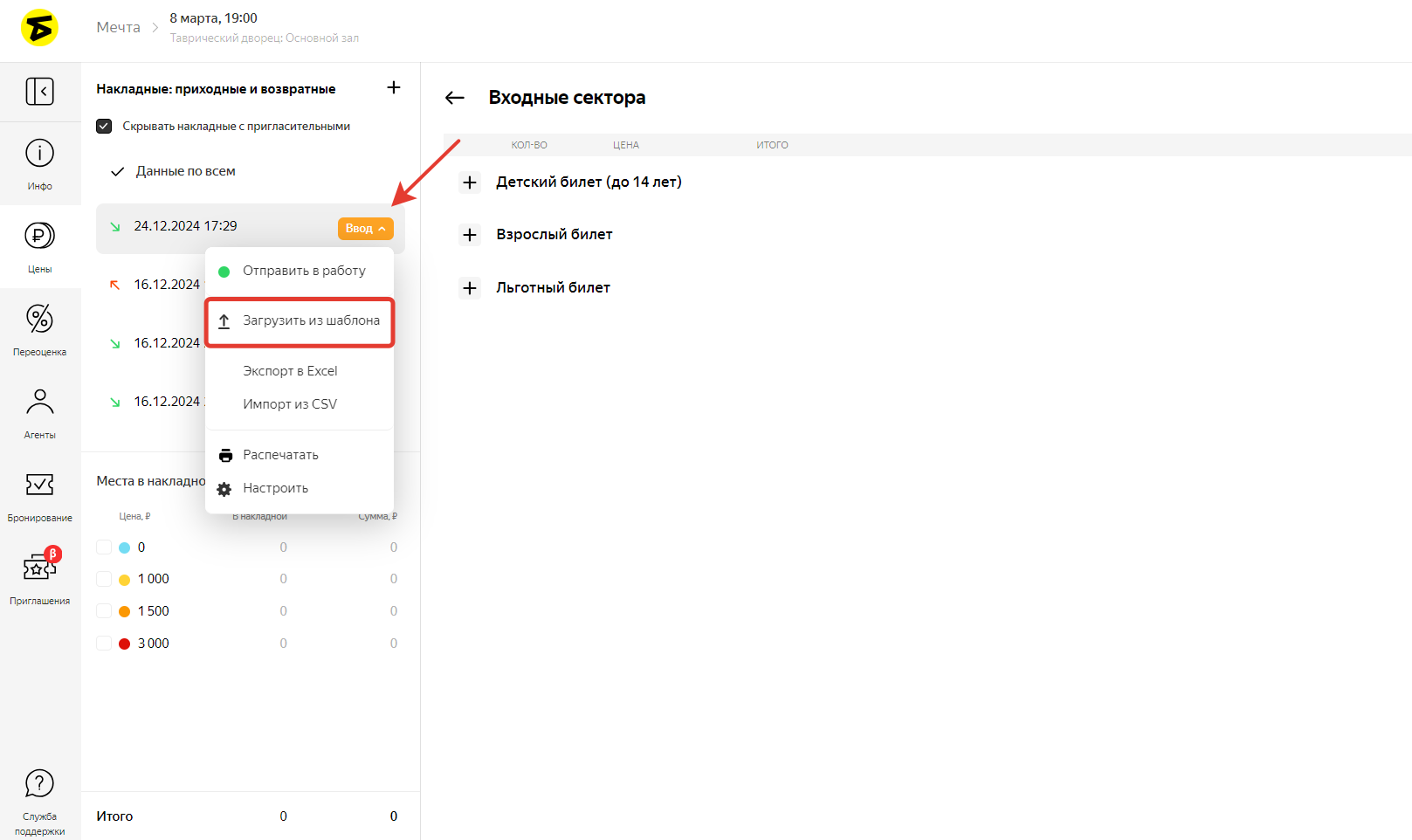 Если на разных событиях у вас часто повторяется одна и та же распоясовка (одни и те же места в тех же секторах стоят одинаково), используйте шаблон накладной.