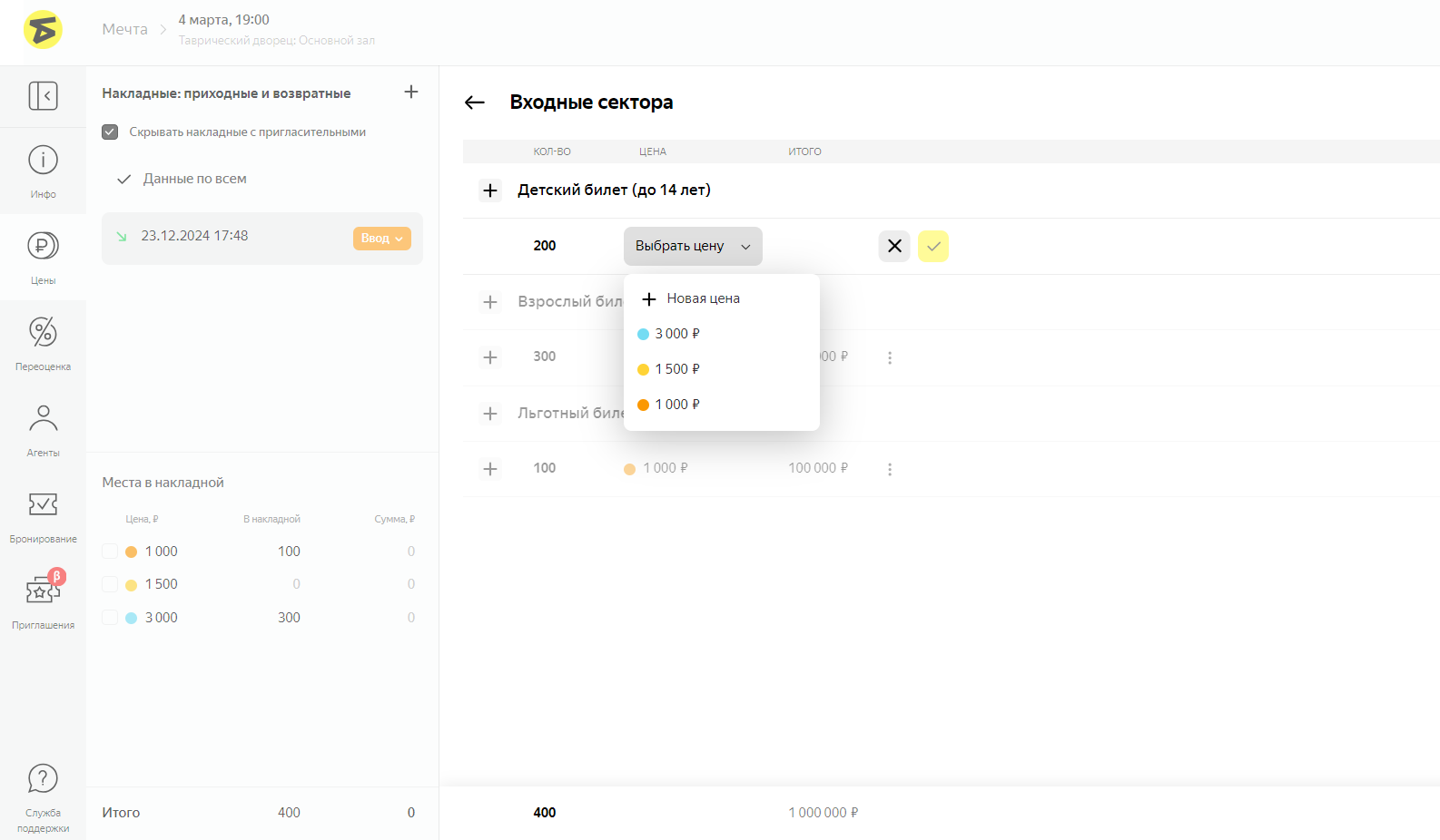Нажмите на кнопку Выбрать цену и укажите цену билетов. Сохранённую цену можно использовать повторно.