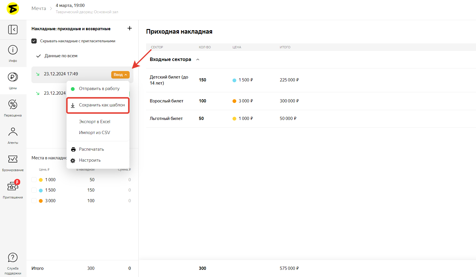 - После расценки мест на левой панели нажмите Ввод →Сохранить как шаблон.