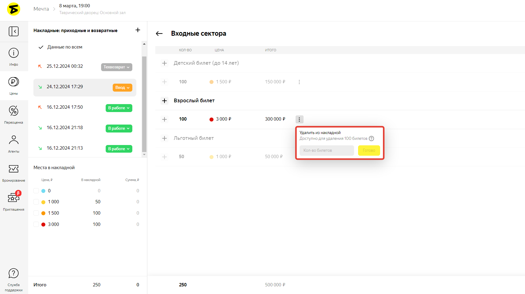 в конце строки с неверно расцененными билетами и введите количество билетов для удаления. Если необходимо, заведите билеты по верной цене повторно через
