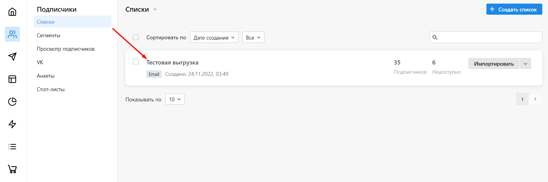 В разделе Списки отобразятся сегменты покупателей, выгруженные из личного кабинета Яндекс Билетов. Нажмите на название нужного сегмента, для которого отправится рассылка.