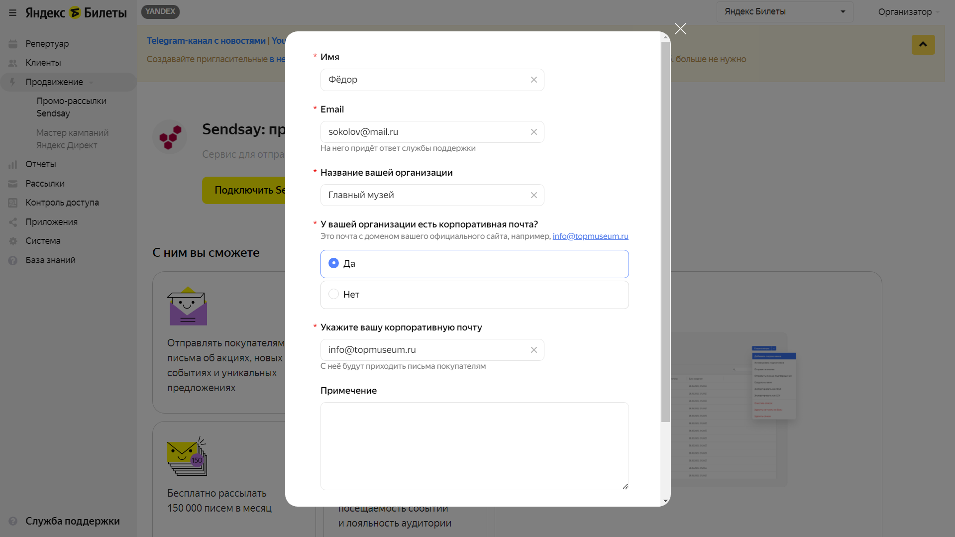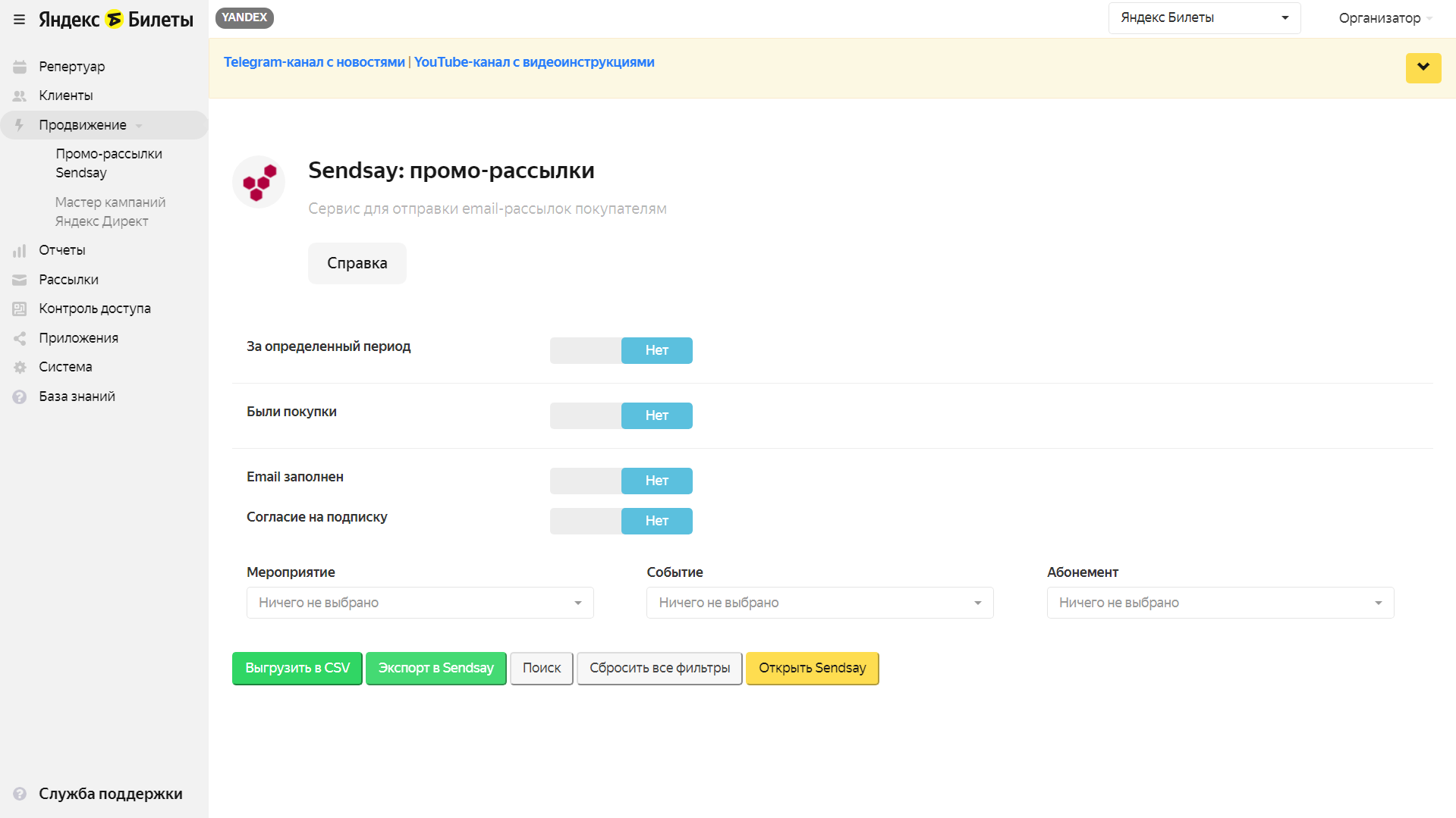 Подключение происходит один раз. После принятия оферты в этом разделе появится меню сегментации покупателей. Входить в личный кабинет Sendsay нужно через раздел Продвижение → Промо-рассылки Sendsay личного кабинета Яндекс Билетов.