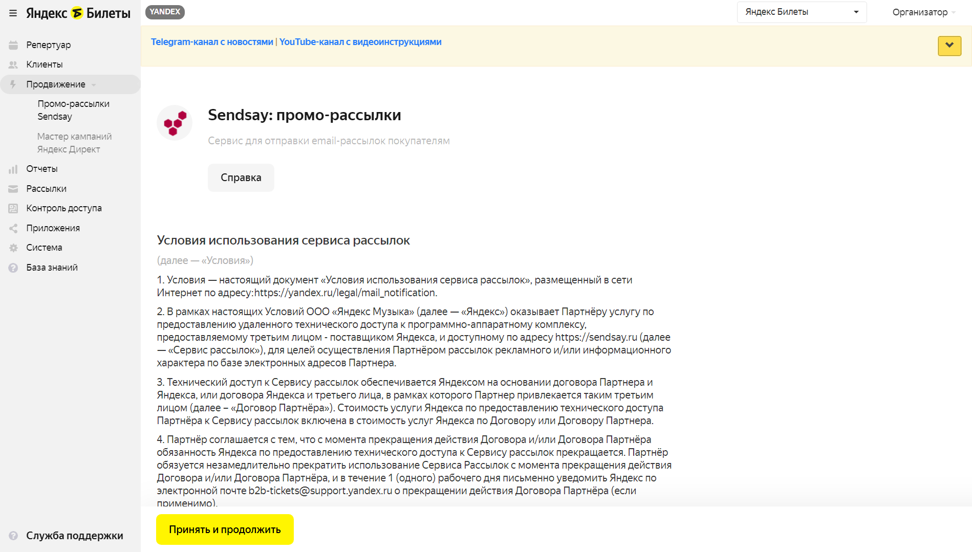 Дождитесь ответа службы поддержки об успешной настройке. Далее ознакомьтесь с договором оферты в разделе Продвижение → Промо-рассылки Sendsay и нажмите Принять и продолжить.