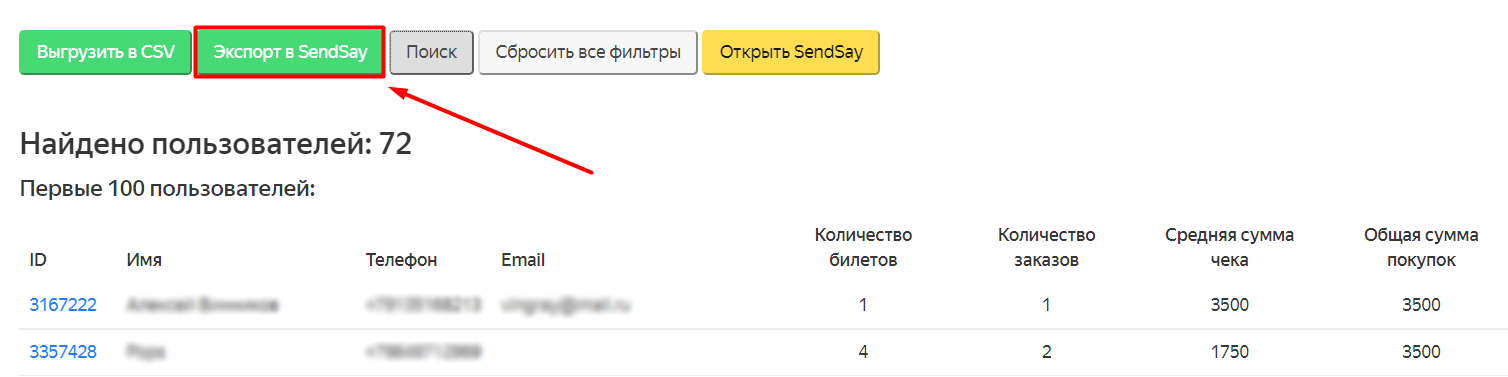 - Данные о покупках зрителя объединяются, когда в заказах указывается одинаковый номер телефона. Если в заказах зрителя единый телефон, но разные email-адреса — выгрузится только последний email.
