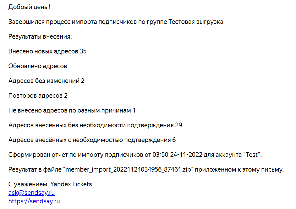 Проверьте электронную почту организации — Sendsay отправит отчёт об успешной загрузке email-адресов личного кабинета.