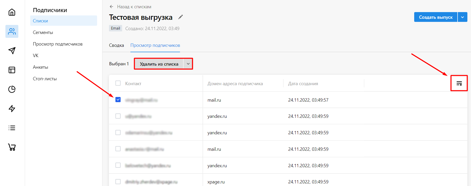 Откройте вкладку Просмотр подписчиков — галочка рядом с почтой позволит удалить лишний email, а правая кнопка