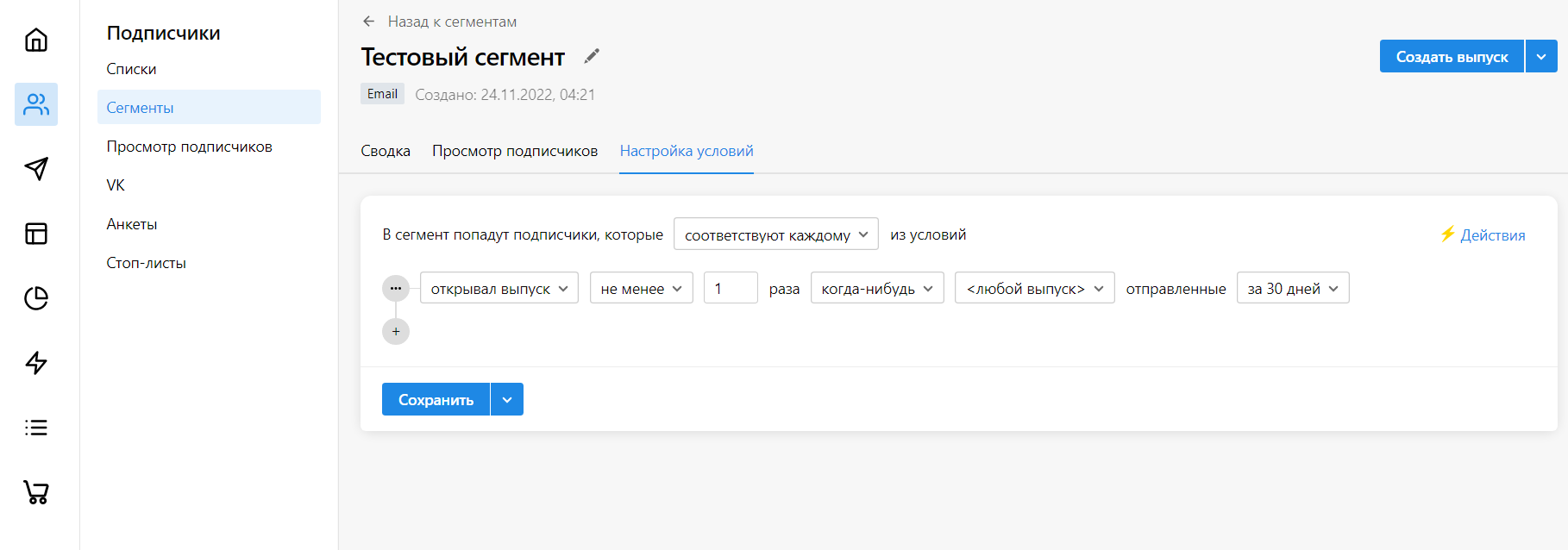 Используйте раздел Подписчики → Сегменты, если на основе сегмента данных из Яндекс Билетов необходимо создать новый с заданными вами условиями. Для этого выберите нужный сегмент и перейдите на вкладку Настройка условий.