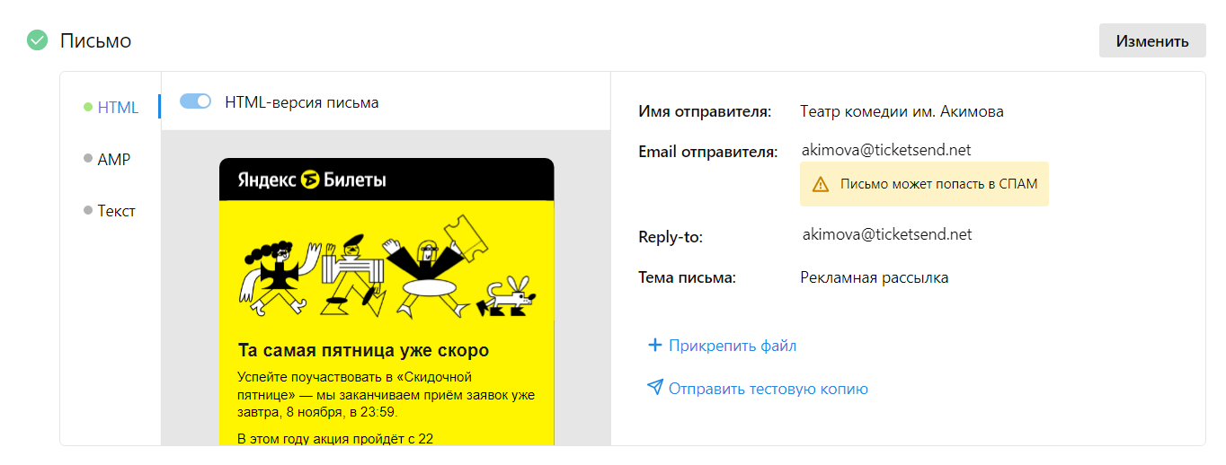 К рассылке можно добавить текстовую и AMP-версии письма: