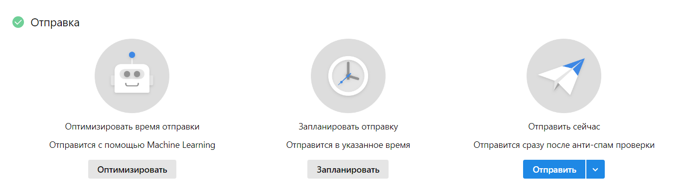 Выберите способ отправки рассылки в блоке Отправка. Рекомендуем использовать Отправить сейчас или Запланировать отправку, функция оптимизации времени отправки подключается отдельно поддержкой Sendsay.