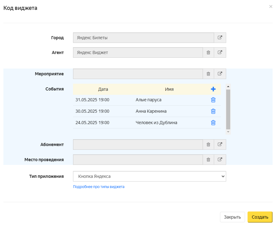 В Яндекс Билетах есть несколько типов виджета. Выберите вкладку, чтобы узнать больше о каждом: