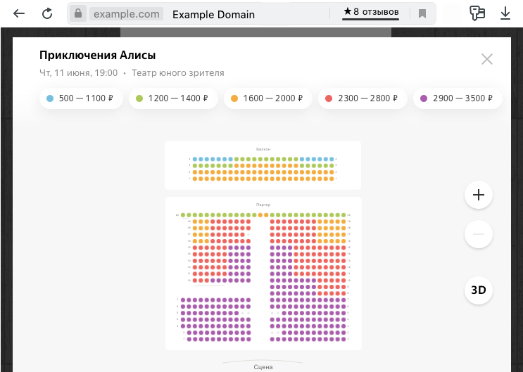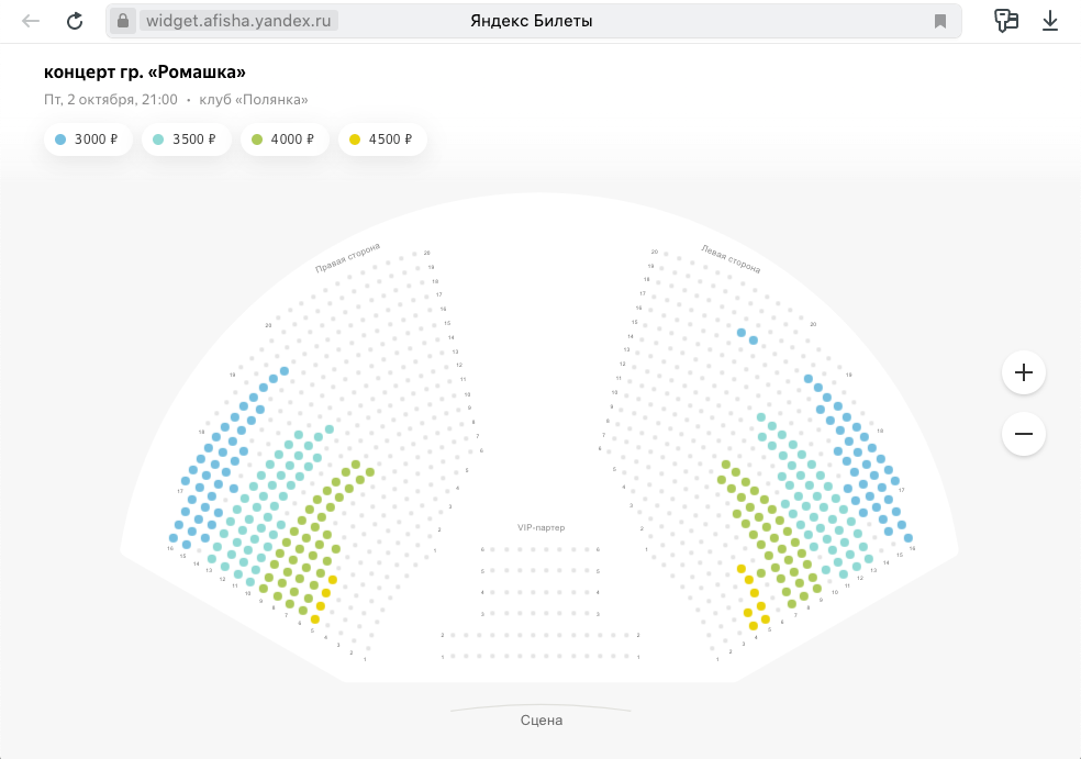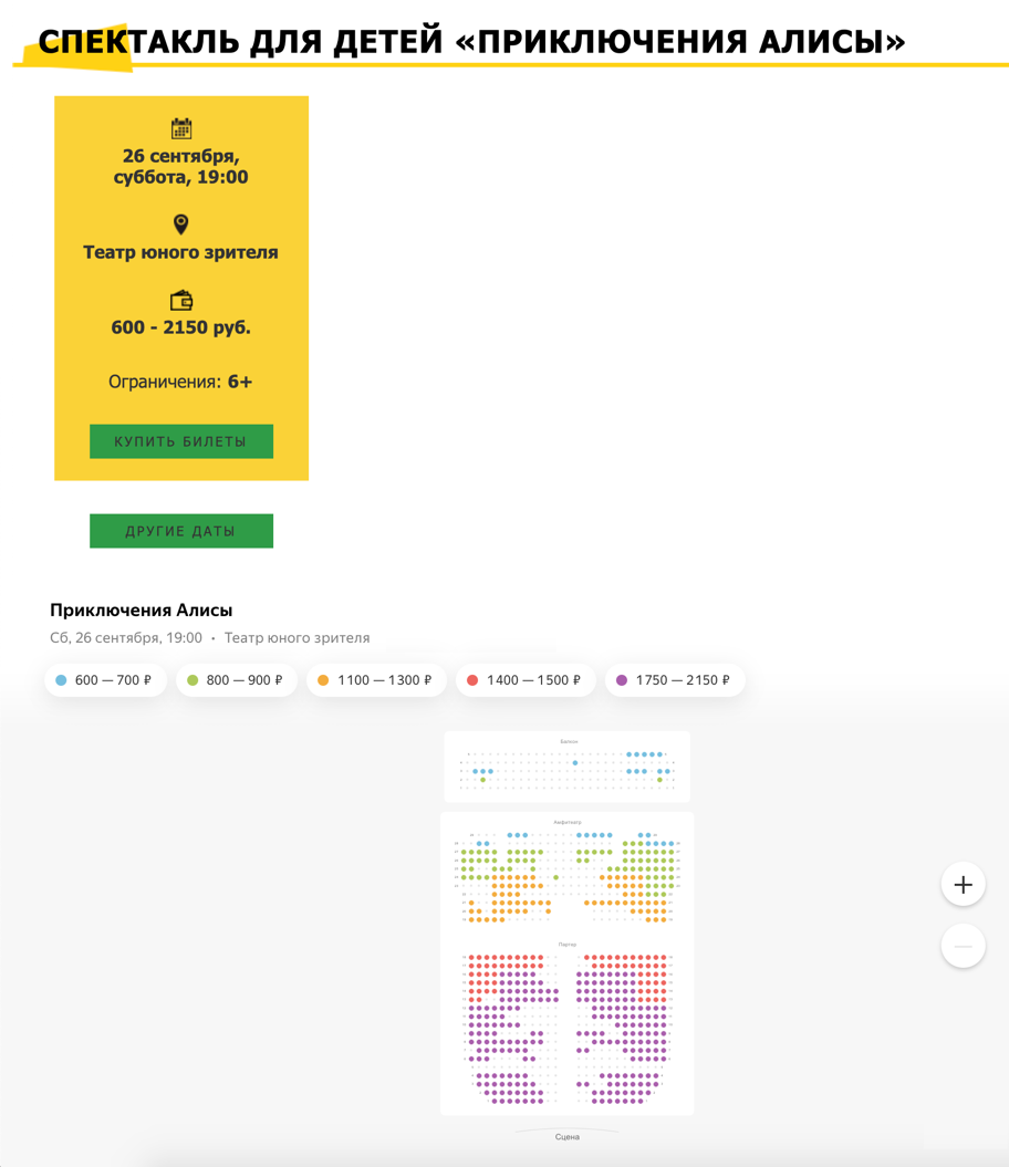 - Место проведения — в виджете будут отображаться все события в одном зале, зрителю нужно выбрать событие, дату и купить билеты.