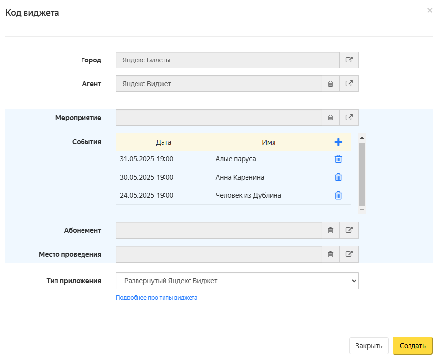 - Мероприятие — в виджете будут отображаться все события одного мероприятия, зрителю останется выбрать дату и купить билеты.