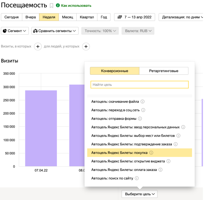 Если на сайте установлен виджет Яндекс Билеты, то с помощью автоматических целей можно отслеживать и анализировать статистику по поиску, выбору, бронированию и покупке билетов на сайте в отчетах Метрики.