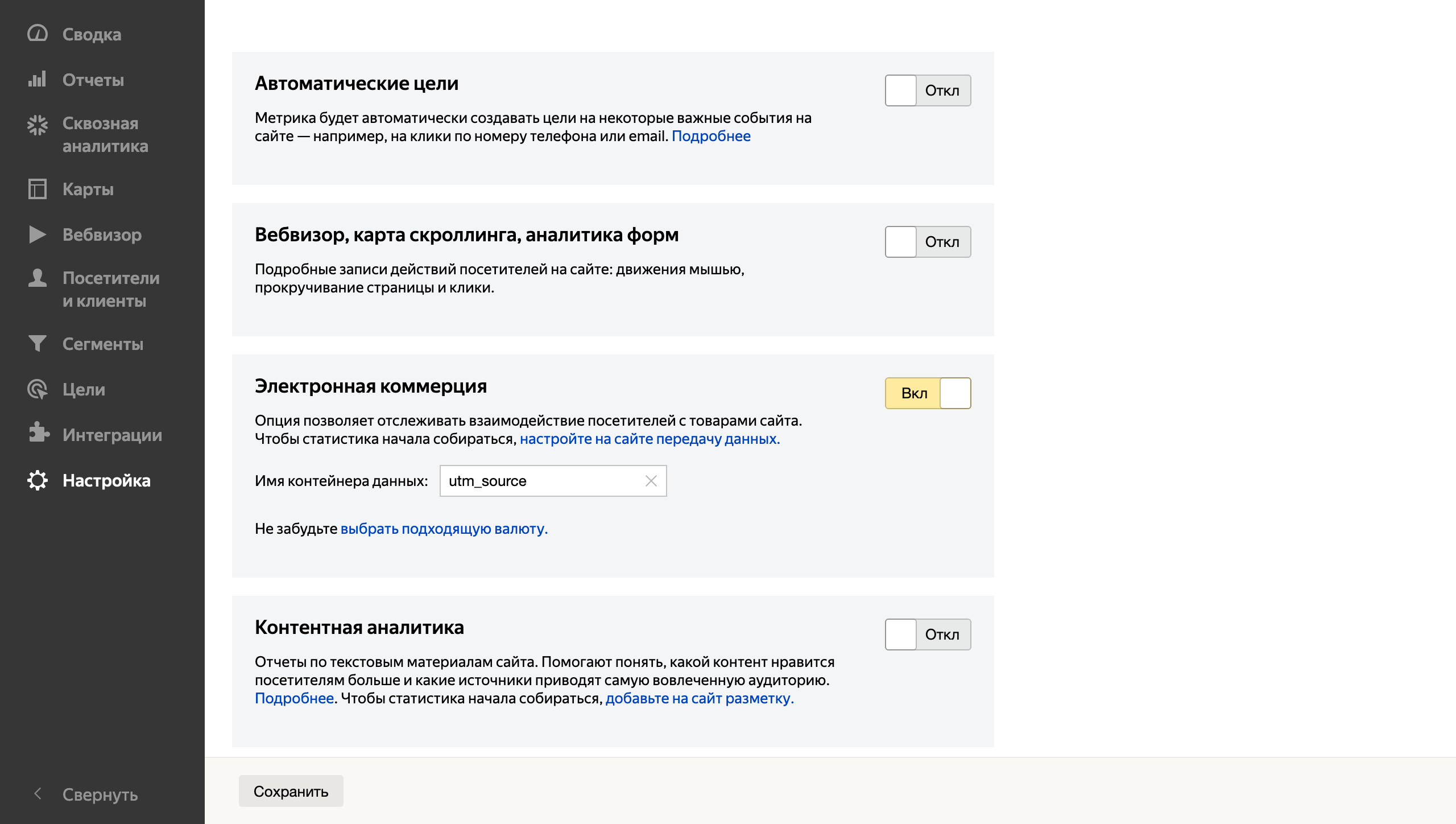 Чтобы подключить Ecommerce, в разделе Настройка → Счетчик включите опцию Электронная коммерция и нажмите Сохранить.