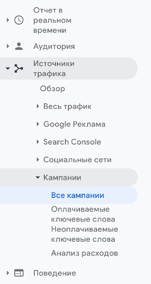 Чтобы посмотреть статистику по UTM-меткам, в разделе Отчёты выберите Источники трафика. Затем нажмите Кампании → Все кампании