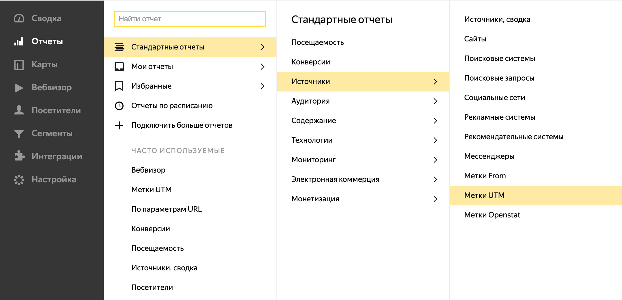 Чтобы посмотреть статистику по UTM-меткам, нажмите Отчеты → Стандартные отчеты → Источники → Метки UTM.