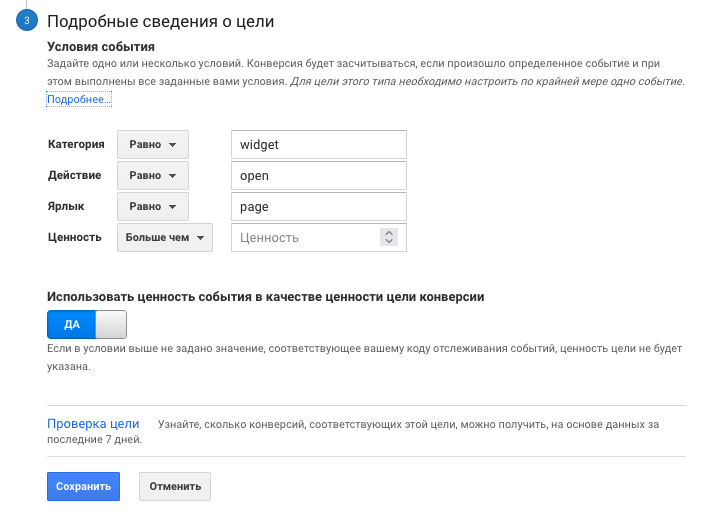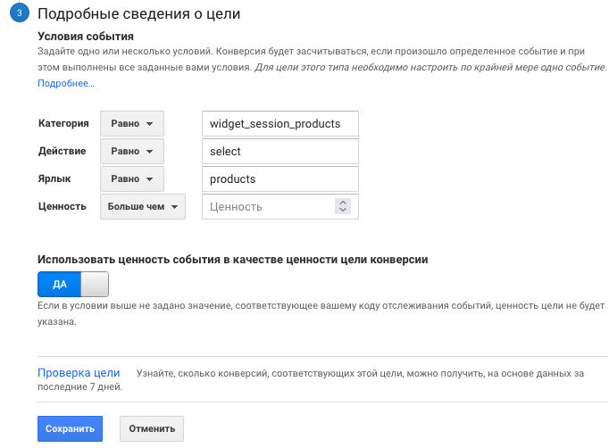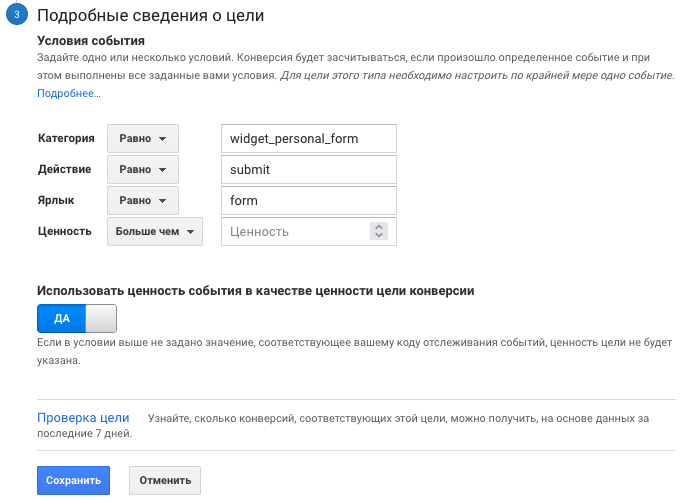 Подобные действия можно совершить со всеми целями и тем самым построить воронку продаж: 100% пользователей зашли на сайт, из них какой-то процент открыли виджет, какой-то перешли к вводу данных и т.п.