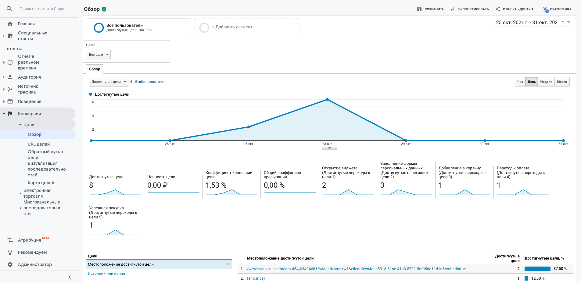 При верной настройке информация о достигнутых целях начнёт отображаться в Конверсии → Цели → Обзор.