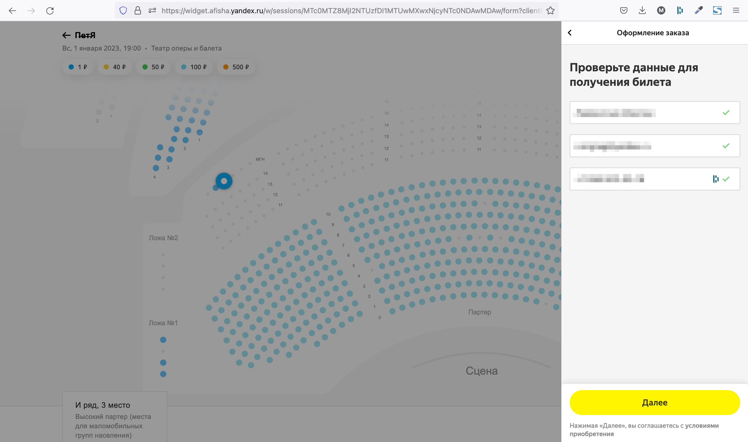 Автоцель Яндекс Билеты: ввод персональных данных |