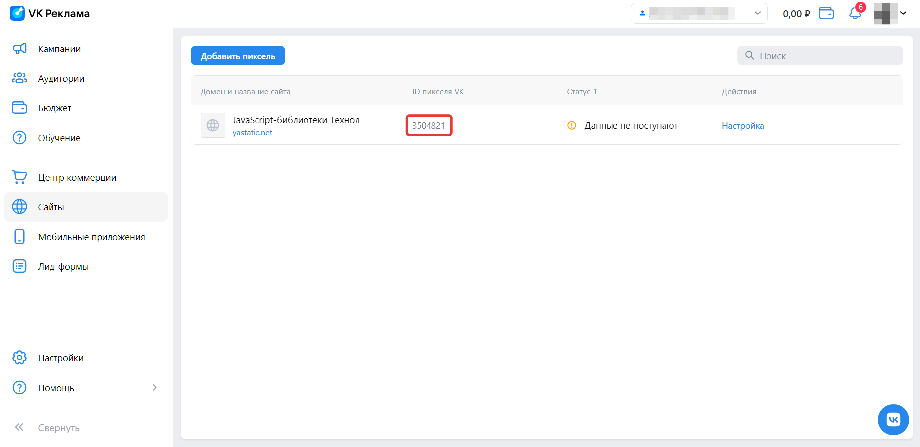 Перейдите в кабинет на платформе VK Реклама и откройте раздел Сайты в меню слева.