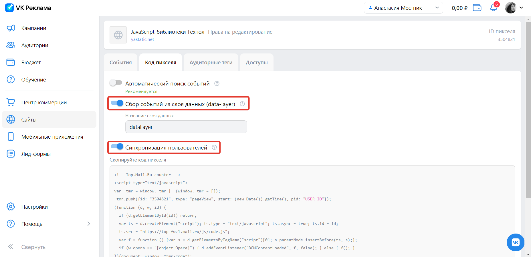 Далее нажмите кнопку Настройки в строке с пикселем и включите чекбоксы Сбор событий из слоя данных (data-layer) и Синхронизация пользователей на вкладке Код пикселя.
